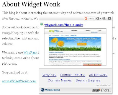 We picked up a tip from WordPress before we left. There are automatic previews of the destinations for all links within WordPress blogs. Here is an image from Widget Wonk WordPress showing the preview for a link to WhyPark.